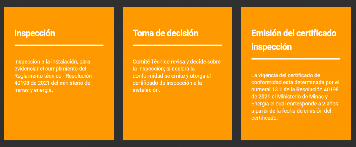 Hemos sido acreditados con la norma NTC–ISO/IEC 17020:2012 como ORGANISMO EVALUADOR DE LA CONFORMIDAD. Desarrollamos nuestras funciones bajo la implementación del Sistema de Gestión, para la verificación del cumplimiento de requisitos del Reglamento técnico para instalaciones de combustible.